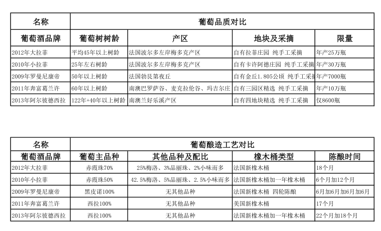 最后我们来五款名酒作一个汇总对比,请看下表:
