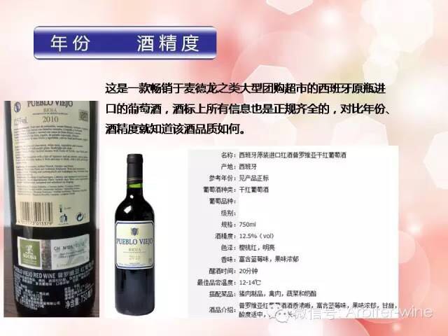 年份:这儿的年份是指葡萄采摘(葡萄酒酿造的开始时间)到灌装出厂(葡萄酒出厂的时间)的时间。我们知道,葡萄酒的酿造有三个过程,一是发酵,是指葡萄采摘、去梗破碎、主发酵、后发酵,在此阶段葡萄酒完成了酿造基础过程;二是储藏,此阶段实现葡萄酒的贮藏和陈酿,进一步提高了葡萄酒的品质,是否经过橡木陈酿以及陈酿时间的长短,是葡萄酒分级的分水岭;三是灌装生产,葡萄酒在此过程装瓶、检验、贴标、包装、出厂。从采摘到装瓶16个月是葡萄酒是否好酒的基本标志,短于16个月,葡萄酒陈酿的时间不够,只能是普通的餐酒。如果年份在16个月以上,那么还要看是否经橡木桶,经过几次橡木桶,时间越久,酒的品质就越好。